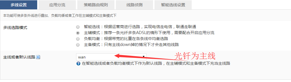 进入【多线设置】---》【多线策略】多线选路设置为“主辅模式”,将主线设置为“WAN”,如下图: