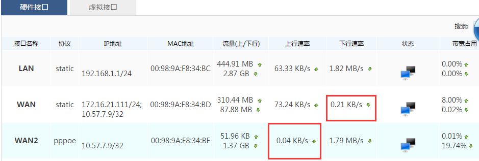 进入【系统状态】---》【接口概览】当前各接口流量状态是否符合预期,如下图: