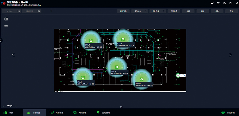 平面位置可视化管理:平台导入平面图纸,实现对AP可视化管理,除了能够直观了解AP的物理部署位置外,在平面视图界面中,AP的在线离线状态、信道设置、功率大小、带机量、终端协商速率等AP运行状态的信息均能够直观呈现,通过平面图可视化界面,能够实时掌握全网AP的运行态势,感知无线网络的健康程度。